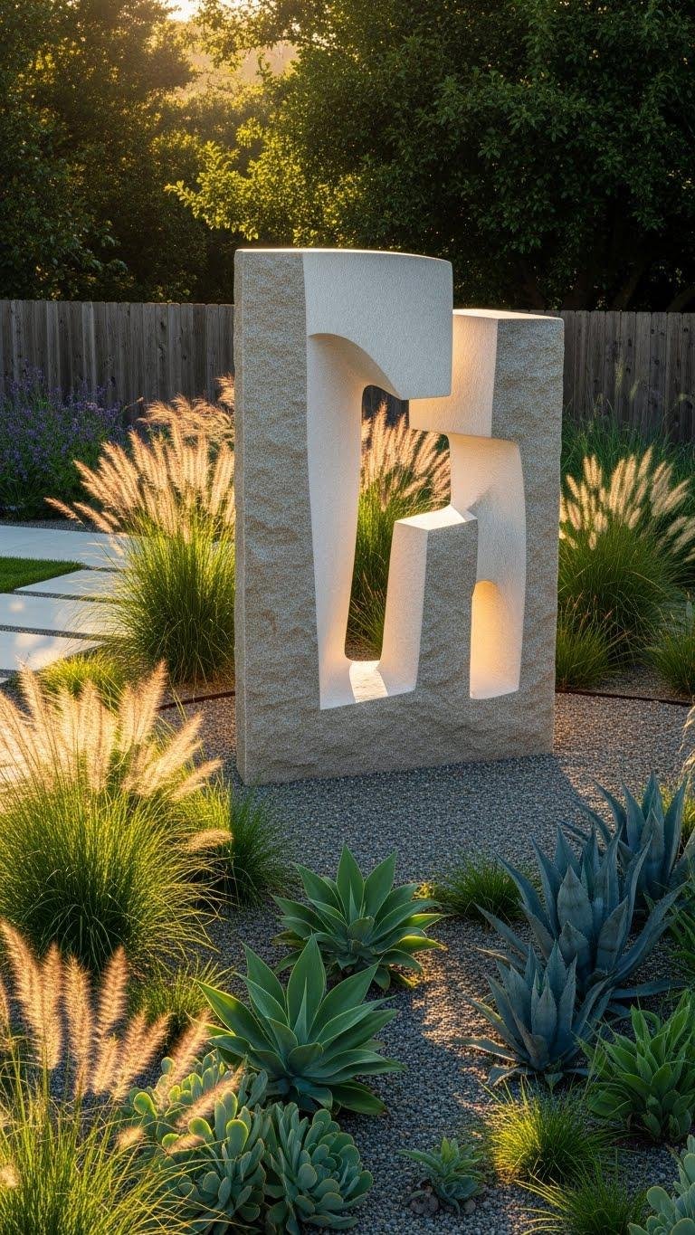 When you place an abstract stone sculpture amid plantings, it becomes a clean, modern anchor that frames foliage and movement without stealing the show.