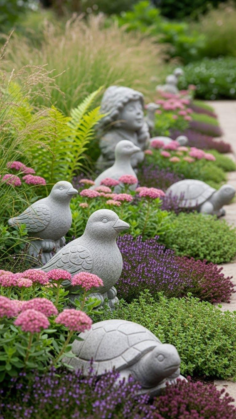 A carved bird or turtle can become a charming counterpoint to swaying grasses and low groundcovers, giving you a sense of personality without overwhelming the planting.