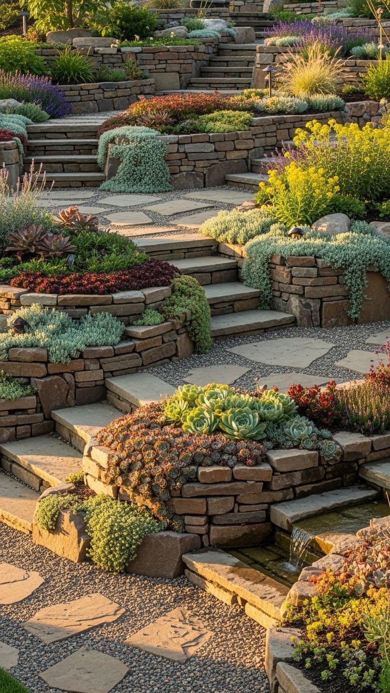 You’ll arrange layered succulents, alpine herbs, and drought-tolerant perennials on terraces of stone. Use stepped irrigation to water precisely, sculpt sightlines, and leave paths for wandering hands and open, carefree planting decisions.