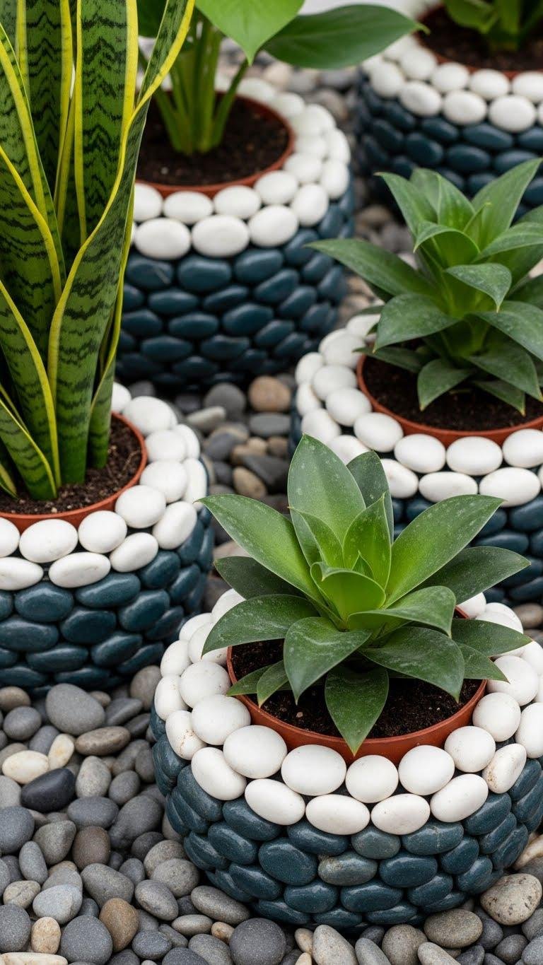 Polished River Stone Accents Around Pots