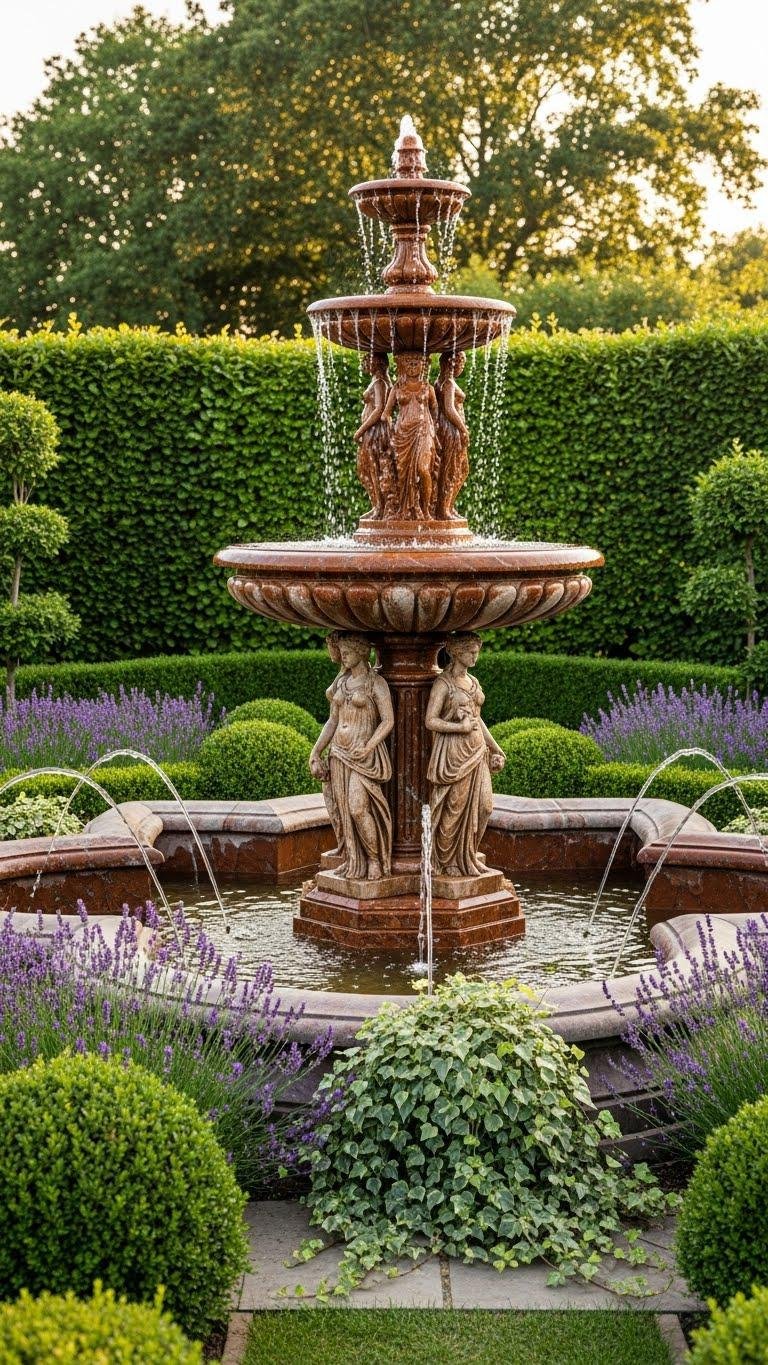 You’ll place a red sunset marble fountain amid sculpted boxwood, fragrant lavender, and trailing ivy so water highlights foliage lines, invites birds, and gives you a free, timeless focal point.