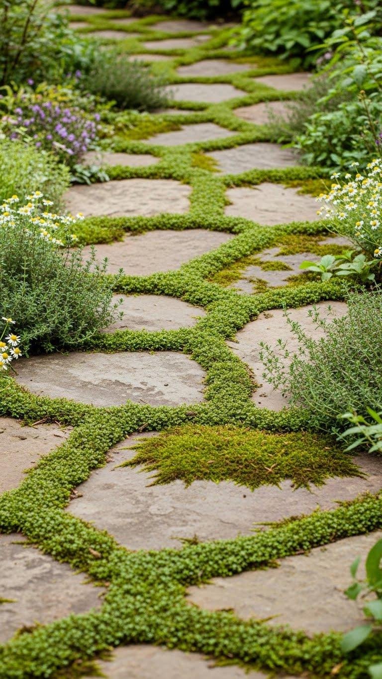 Lay smooth, contrasting pebbles into a shallow bed to create a mosaic path that guides the eye with floral or wave motifs, and plant low-growing herbs like thyme, sedum, or creeping phlox between the stones so the designs feel alive and fragrant underfoot.
