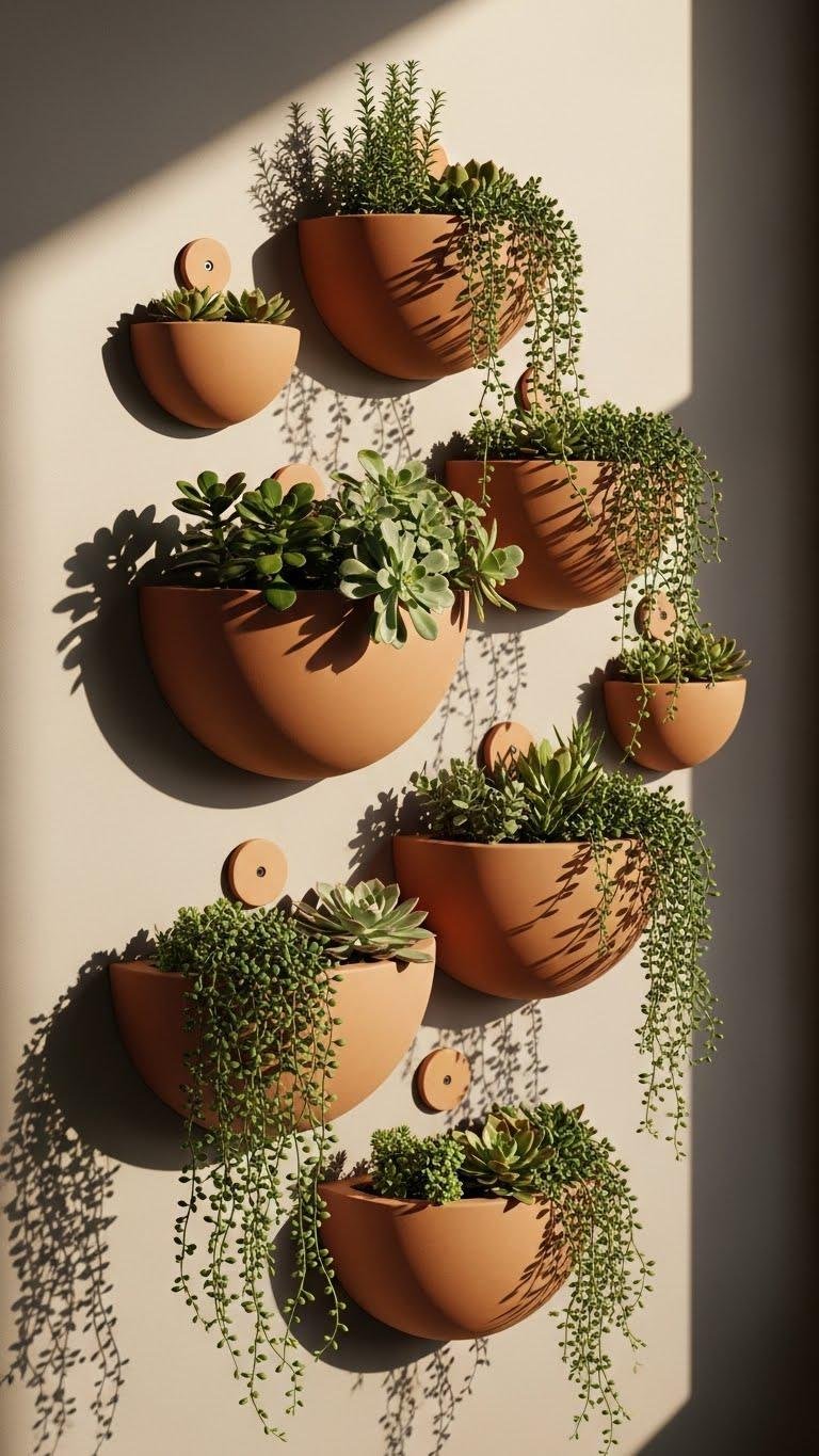 If you loved the lush grid’s layered texture, try a staggered wall of terracotta half-moons for a warmer, sculptural look. You’ll arrange matte terracotta pockets in staggered mounting, letting trailing succulents and herbs spill from curved bowls.