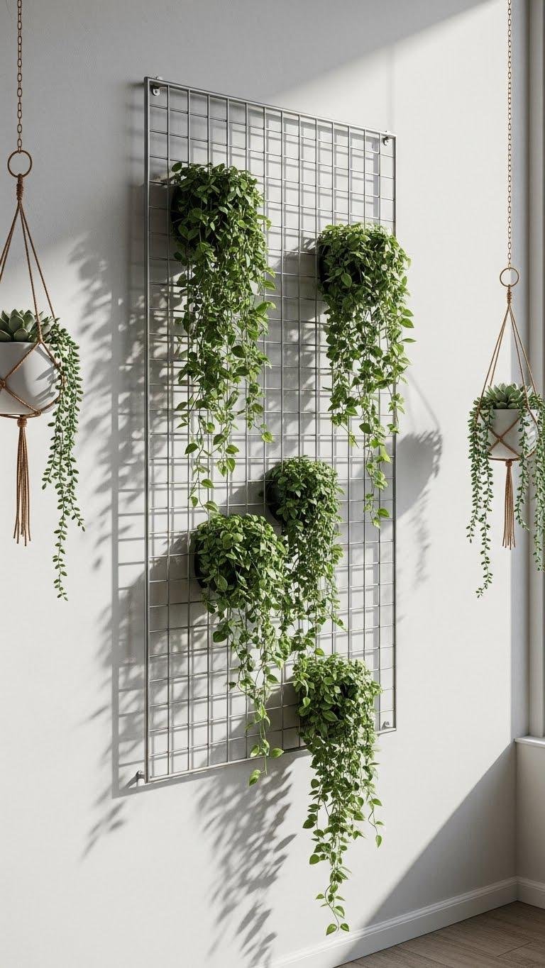 When you mount a sleek wire mesh panel, trailing vines tumble through its geometric grid, turning a flat wall into a living curtain that feels airy and modern.