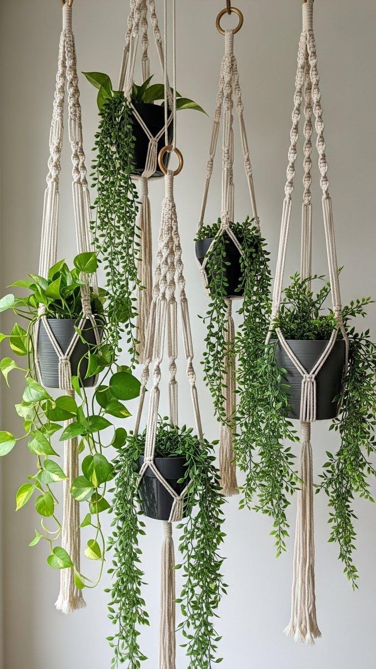 Tie together boho charm and modern greenery by hanging macramé plant holders at varied heights to create a living, textured tapestry.