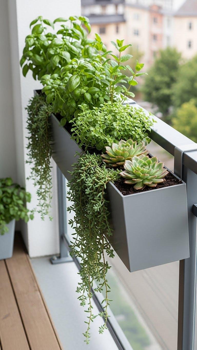 Along a slim balcony rail, a vertical planter strip lets you layer greenery without losing floor space. You’ll mount a vertical herbstrip for basil, mint, and compact greens, and pair a slender succulentbank of trailing sedum and rosettes below.