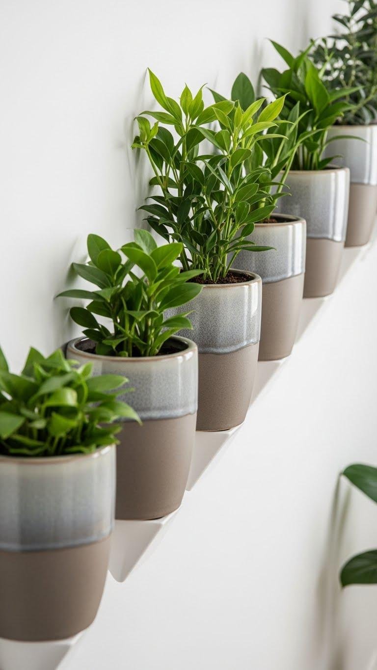 Perched discreetly at eye level, a floating planter ledge turns a narrow shelf into a vertical accent, letting upright plants like snake plants, dracaenas, and small palms create architectural height without cluttering floor space.