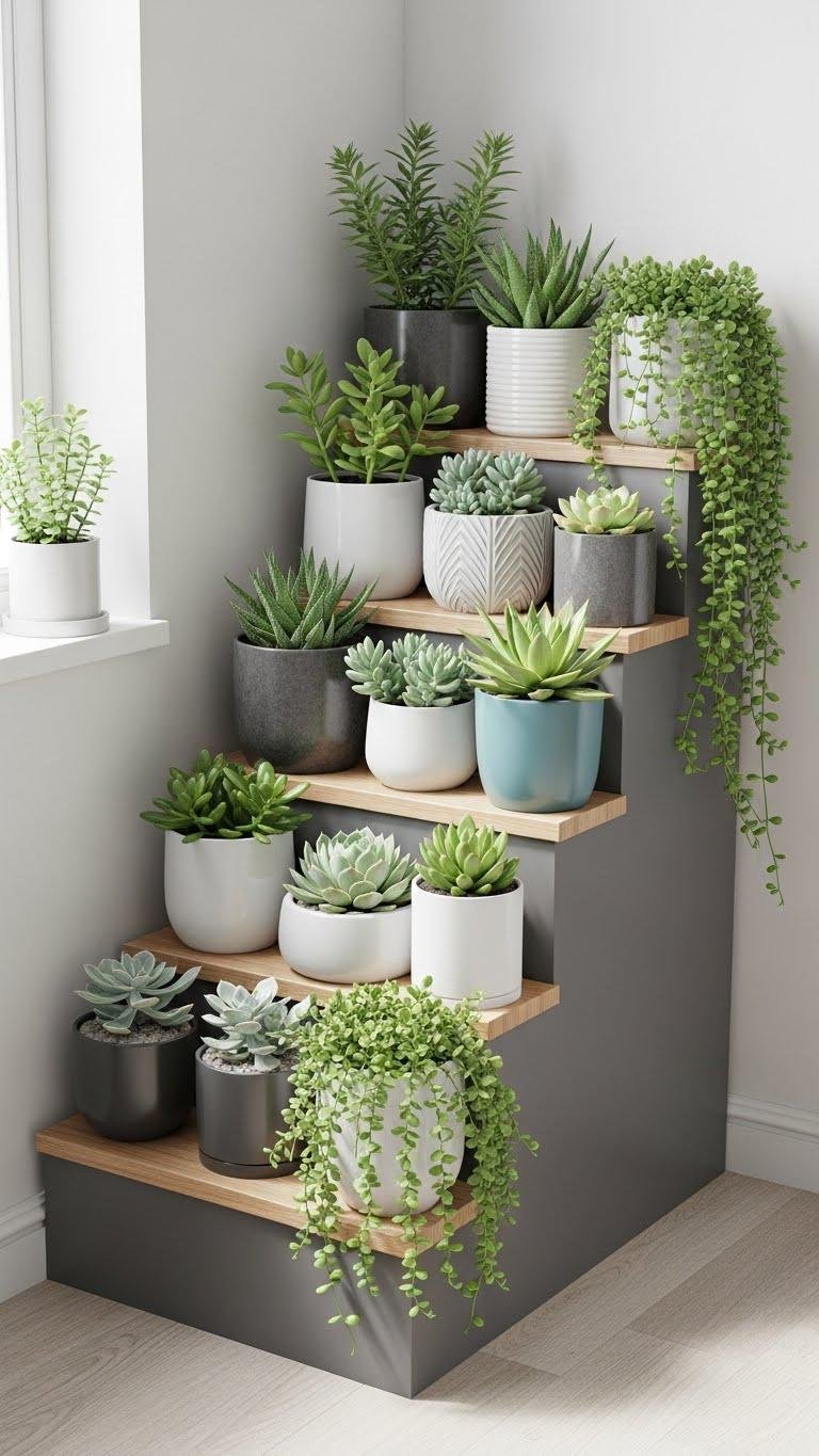 Stack compact stair-step shelves to carve out a vertical garden without taking up floor space. You’ll arrange succulents and trailing vines on graduated tiers, using stair step styling to create rhythm and depth.