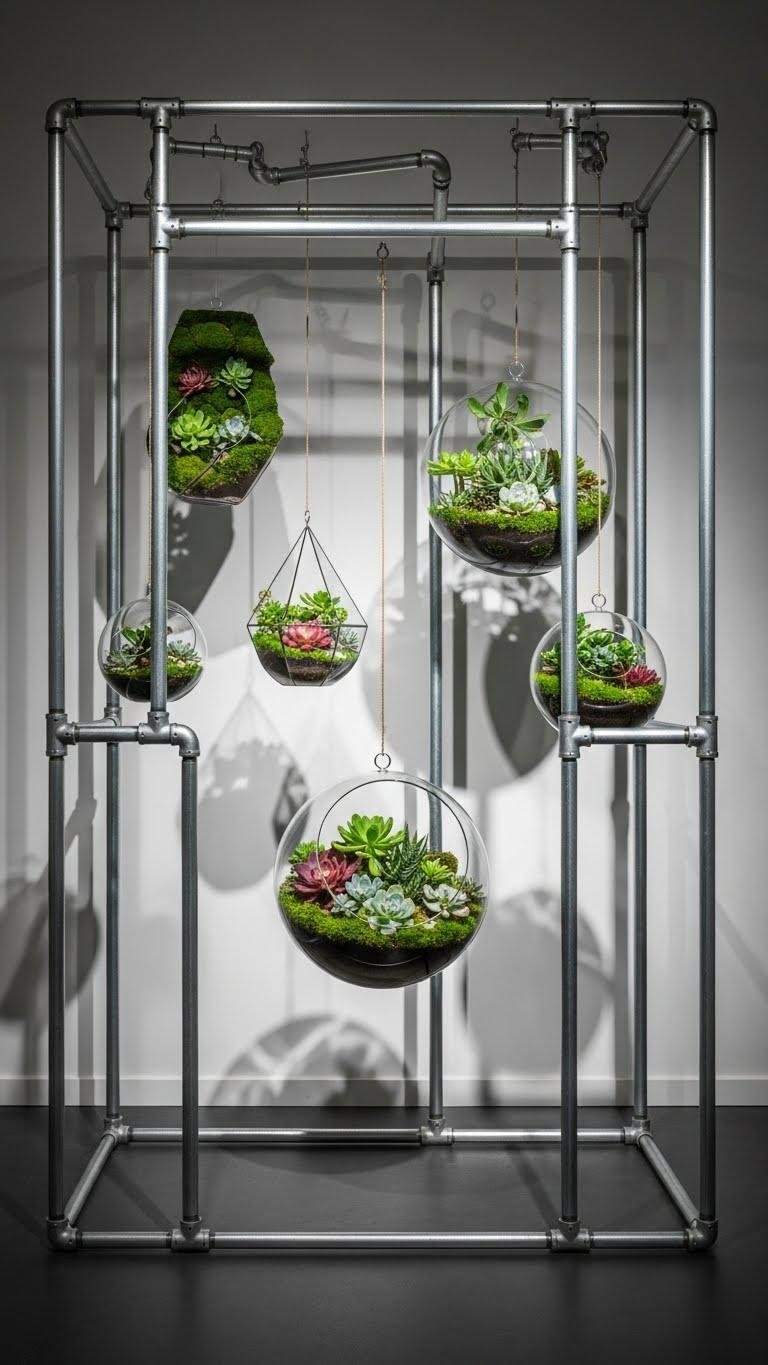 You’ll love how an industrial terrarium hangs within metal pipework greenery, casting geometric shadows and sheltering succulents.