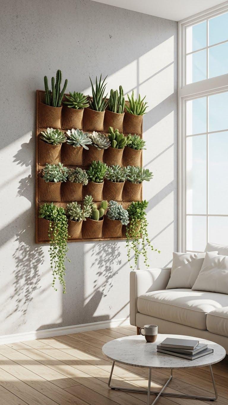 Often overlooked, a woven pocket panel brings succulents into tight spaces with a tactile, modern look. You’ll love how handwoven pockets create rhythm and texture, letting you arrange drought tolerant mixes in sculptural patterns.