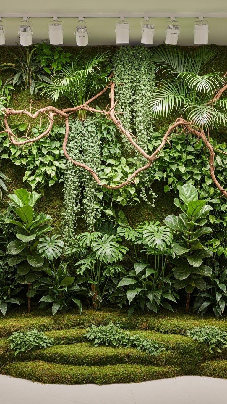 You’ll craft a vertical canopy that frees the space, mixing hanging vines with structural palms. Add a layered mossscape for softness and sound-dampening — bold, breathable, and effortlessly wild.