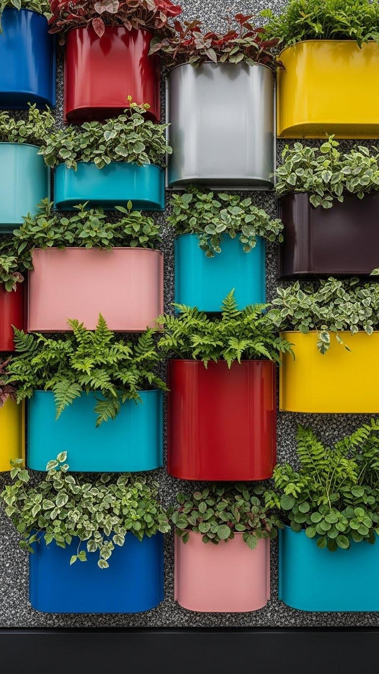 A handful of brightly painted metal pockets can turn a plain wall into a graphic, plant-filled statement that reads like modern art. You’ll arrange color-blocked panels to create rhythm, pairing bold contrasts with varied greenery.