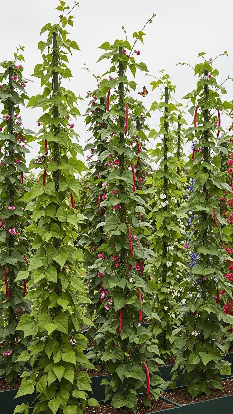 Trellis-wrapped climbing beans bring kinetic texture to a vertical planter, guiding vigorous vines up slim supports so you get lush green layers without taking up floor space.