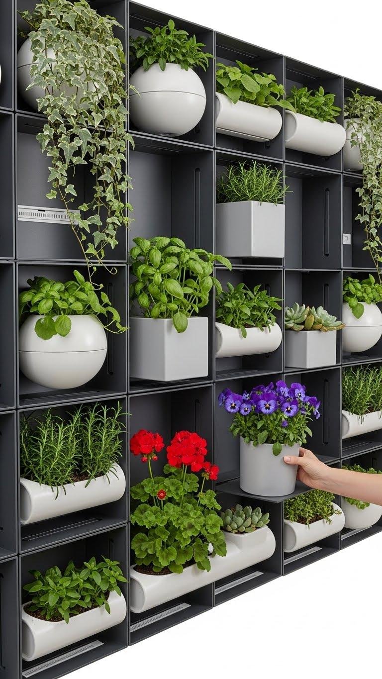 Snap modular grid panels together to build a clean, customizable vertical matrix where each slot holds a removable pot you can lift out for watering, swapping, or seasonal rotation.