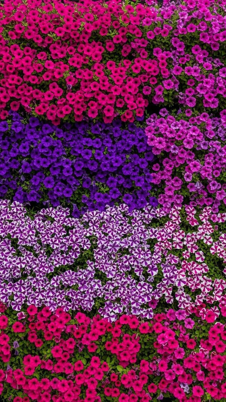 A vivid block of trailing Supertunias turns a blank wall into a living mural, their dense cascades of magenta, purple, or bi‑color blooms read like a painter’s swatch from a distance and reveal riotous texture up close.