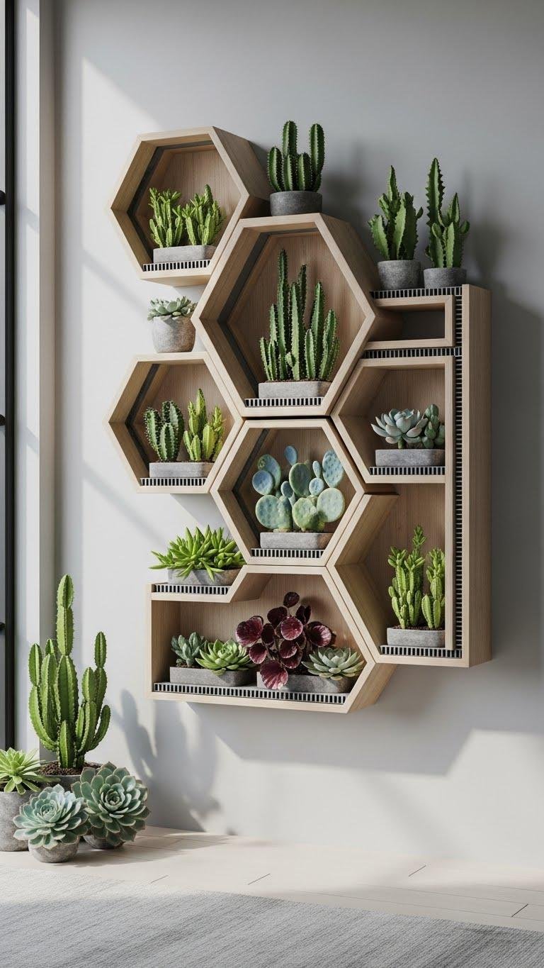 Clean lines and layered shapes transform a wall into a sculptural garden when you combine geometric shelves with a mix of compact succulents.