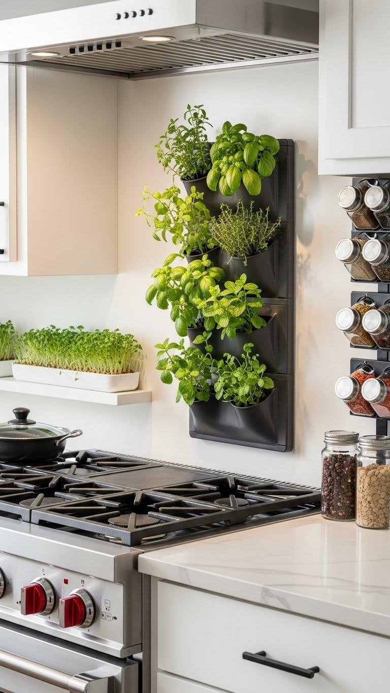 Bring fresh flavor up from floor level by mounting a vertical herb garden just steps from your stove — it saves counter space and keeps fragrant greens within easy reach.